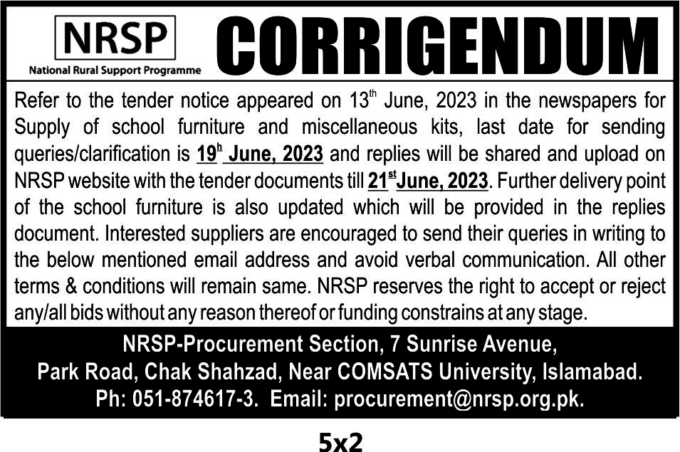 Last date for submission of tender is June 26, 2023 till 3:00pm at NRSP HO, IRM Complex, Chak Shahzad, Islamabad.